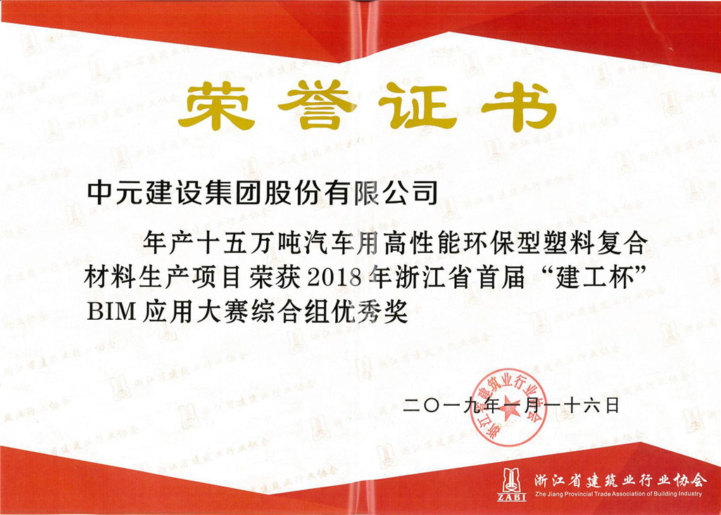 2018年浙江省首届建工杯BIM应用大赛综合组优秀奖(年产十五万吨汽车用品高性能环保型塑料复合材料生产项目)