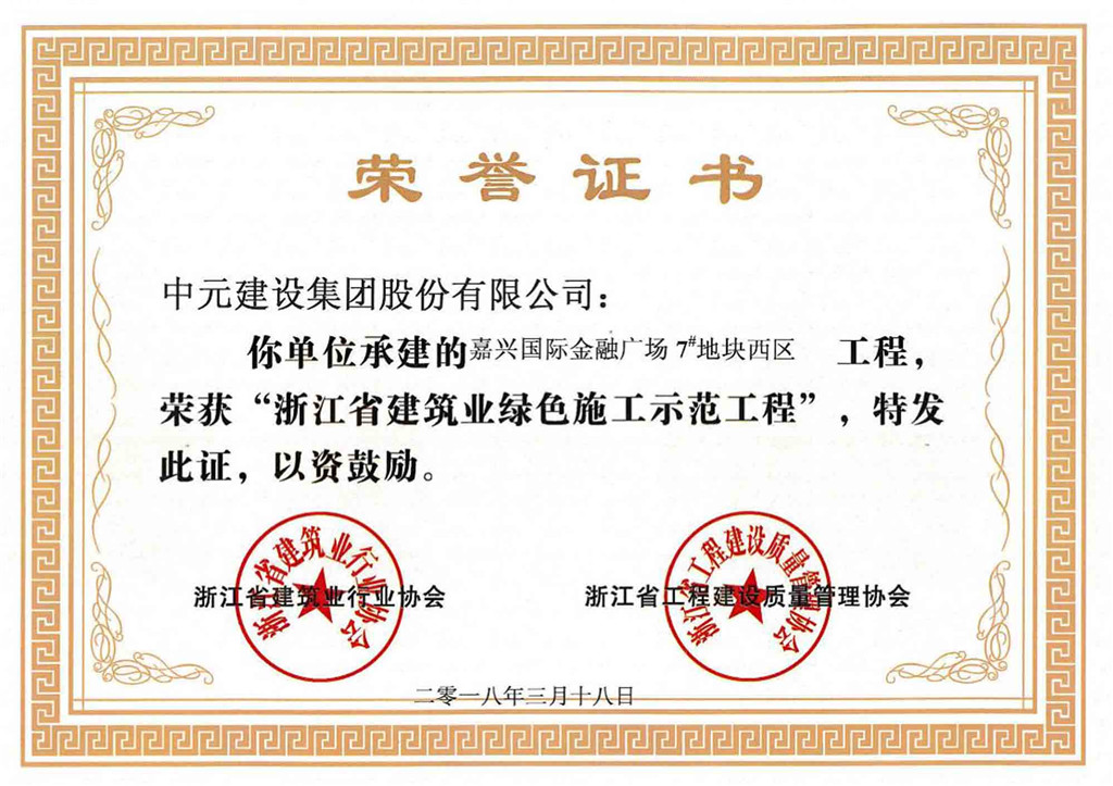 浙江省建筑业绿色示范工程(嘉兴国际金融广场7号地块西区工程)