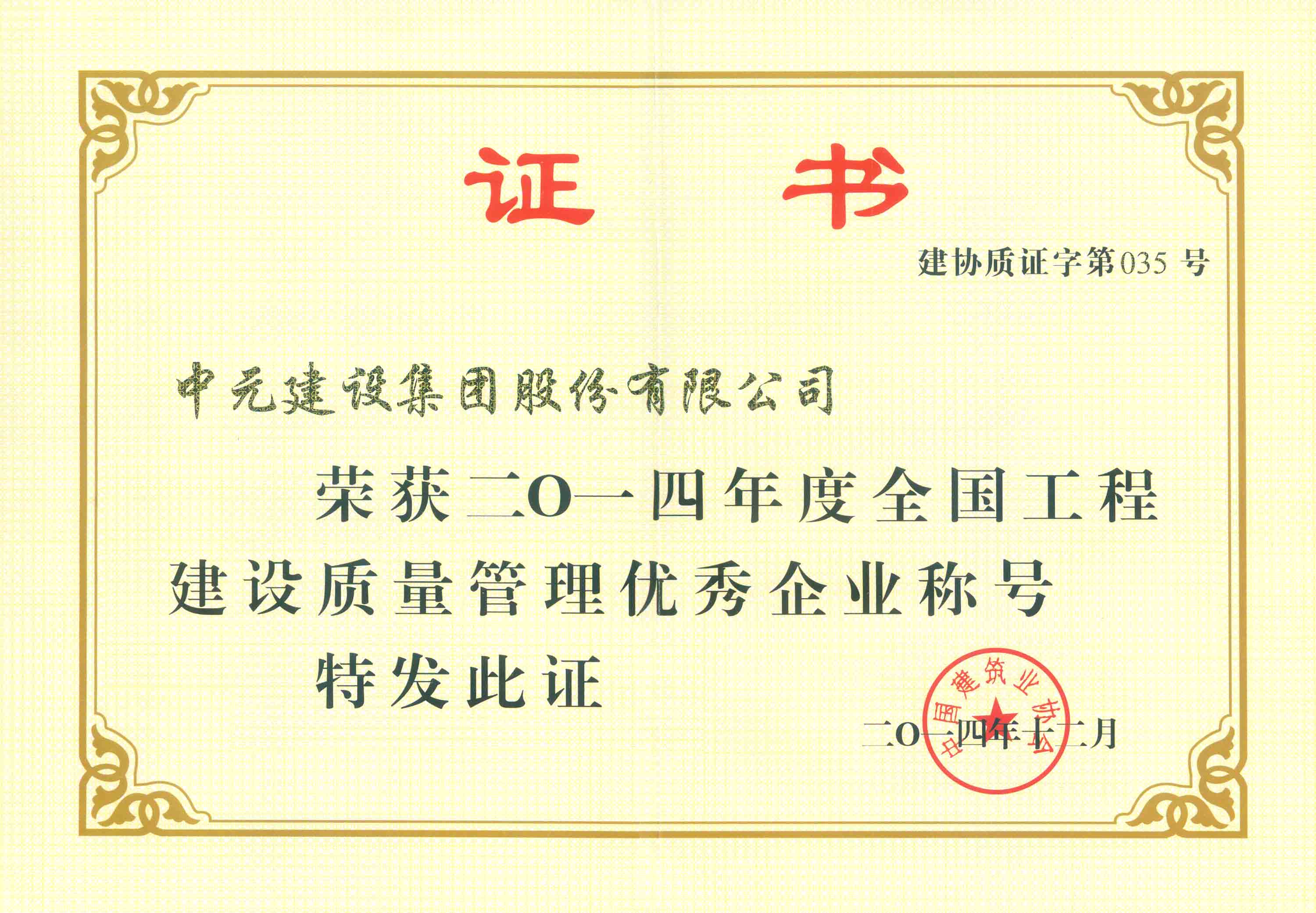 2015年度全国工程建设质量管理优秀企业荣誉证书
