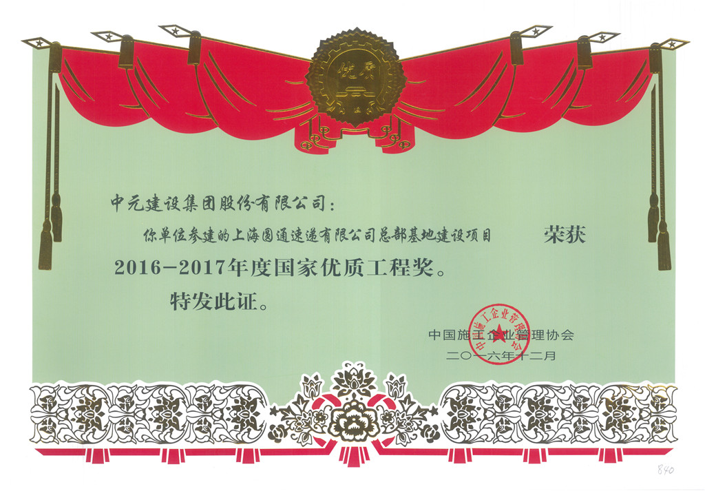 2016-2017年度第一批国家优质工程奖工程荣誉证书(上海圆通速度)