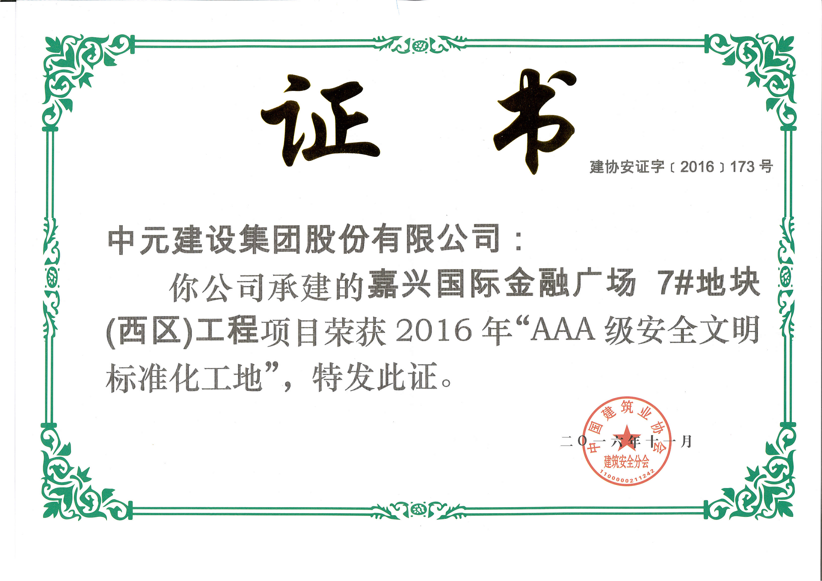 2016年“AAA级文明标准化工地“荣誉证书