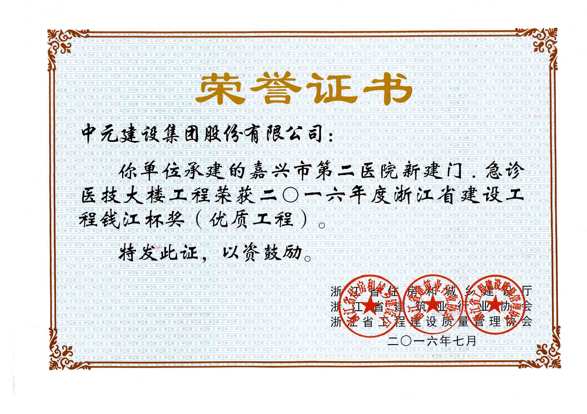 2016年度浙江省建设工程钱江杯(优质工程)嘉兴市第二医院新建门、急诊医技大楼工程