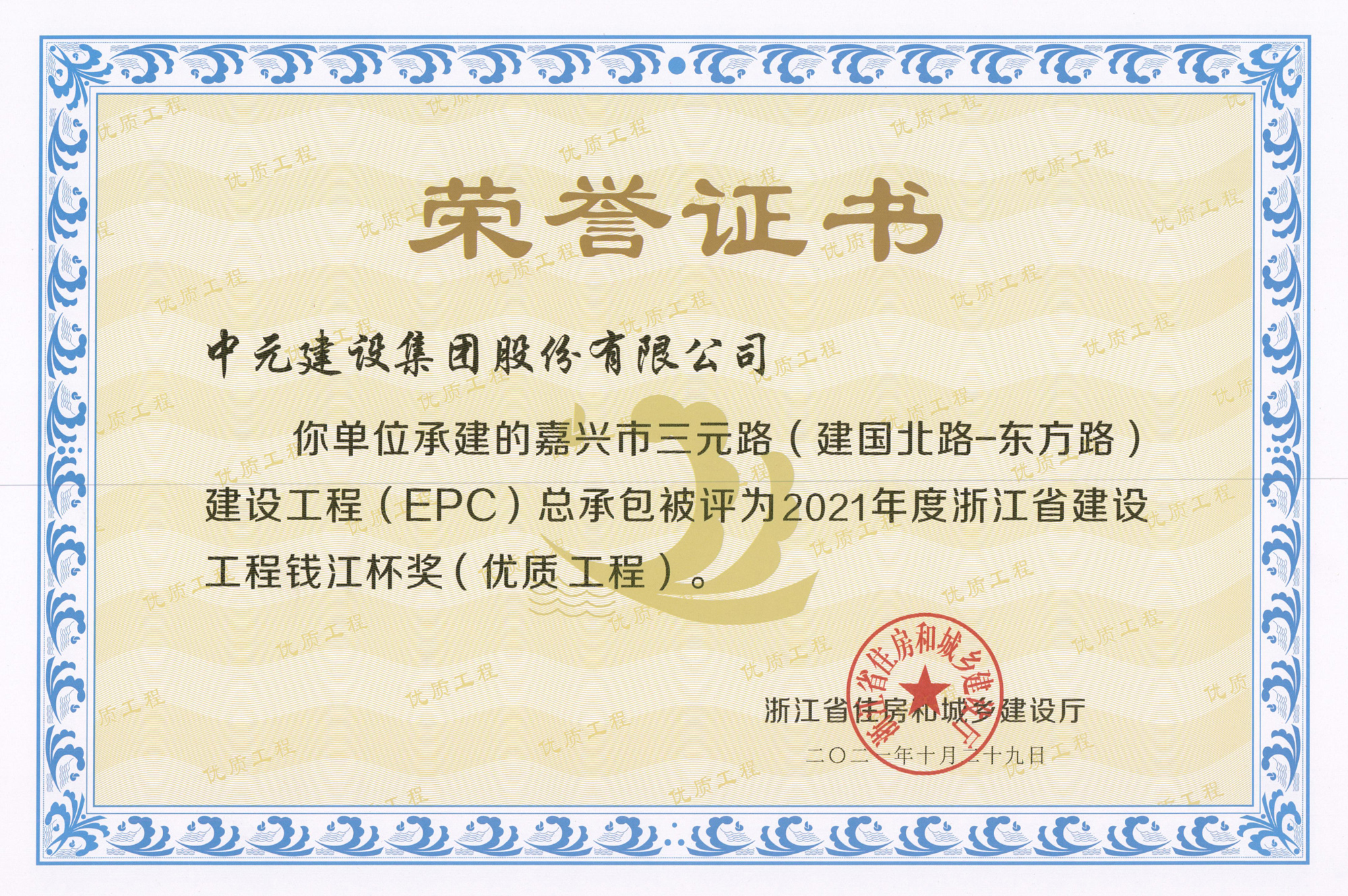 2021年度浙江省建设工程钱江杯-嘉兴市三元路(建国北路-东方路)建设工程(EPC)总承包