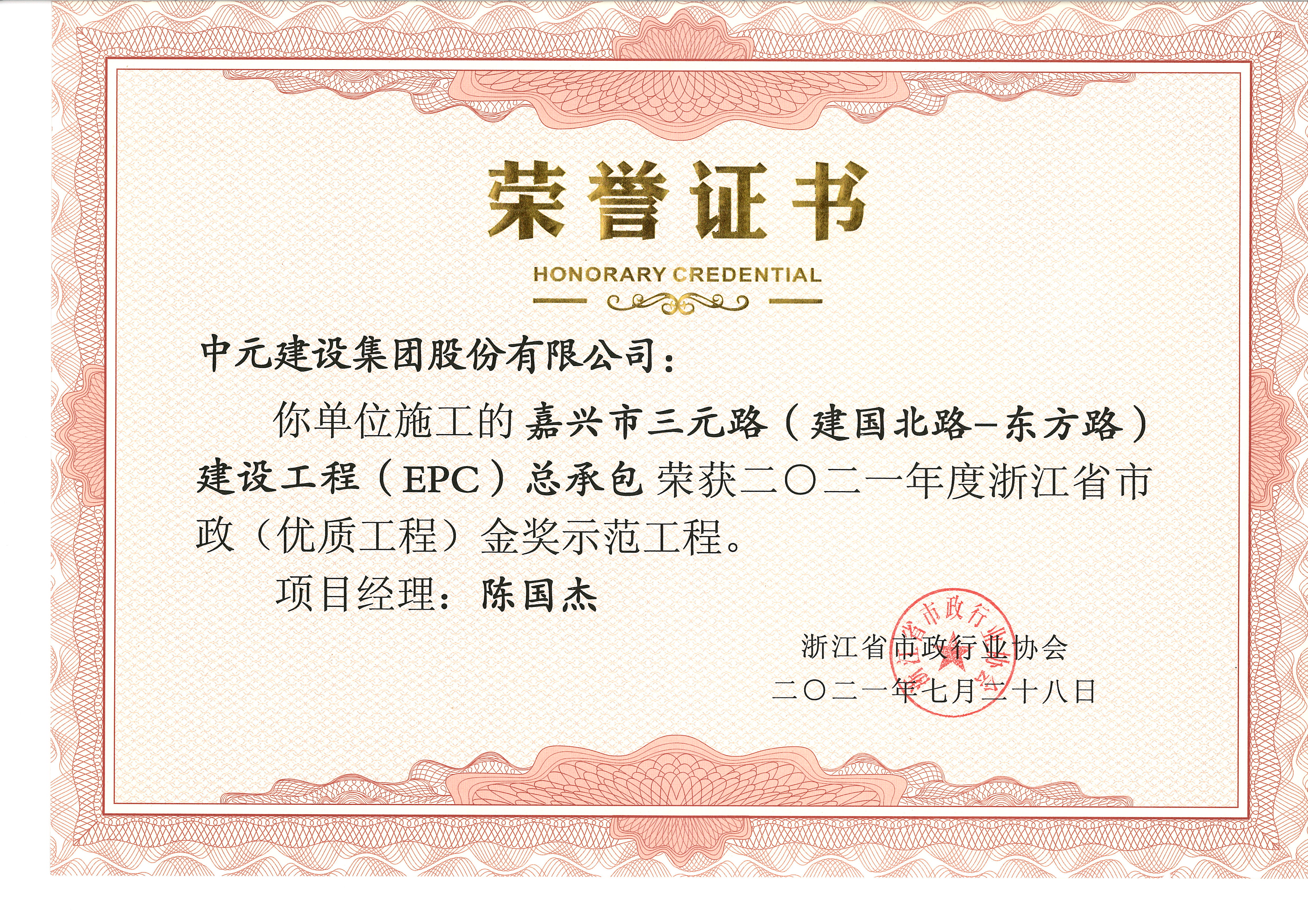 2021年度浙江省市政(优质工程)金奖(三元路)