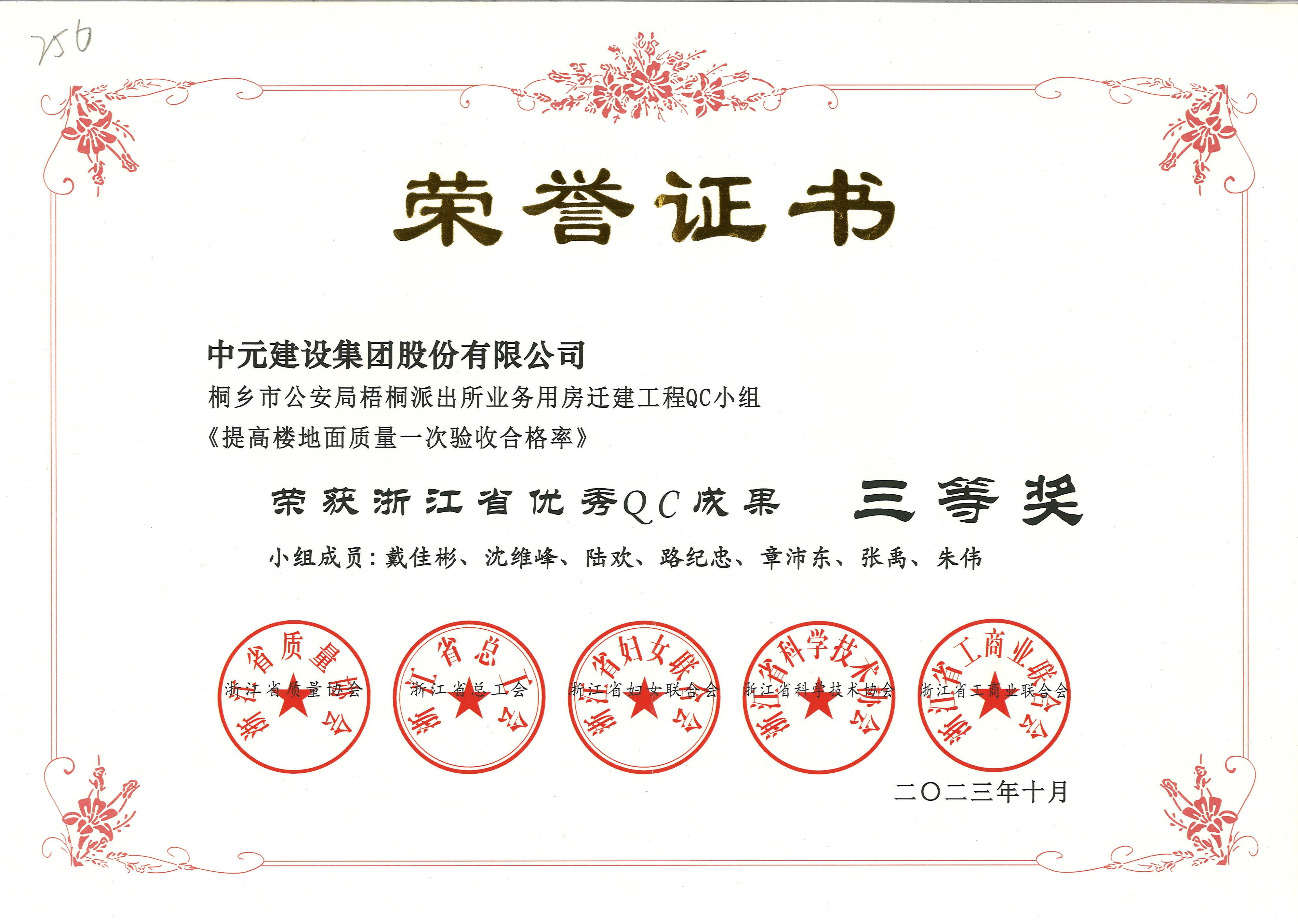 2023年度浙江省优秀QC成果三等奖(桐乡市公安局梧桐派出所业务用房)